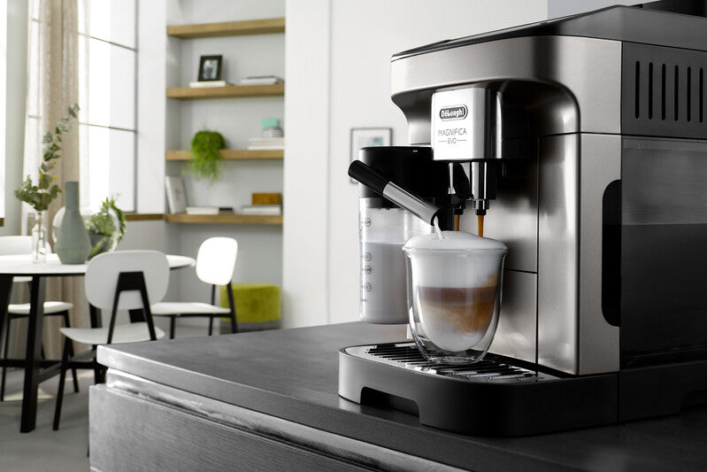 Magnifica Evo encarna la experiencia De'Longhi con su tecnología avanzada, bebidas auténticas y un diseño moderno y elegante.Sirva el espresso italiano perfecto y una variedad de otras bebidas, cubierto con una cremosa espuma de leche gracias a la tecnología LatteCrema Hot, sin desperdicio de leche gracias a la función MyLatte.Puede elegir entre 7 bebidas de un solo toque a través de una sencilla interfaz de usuario.