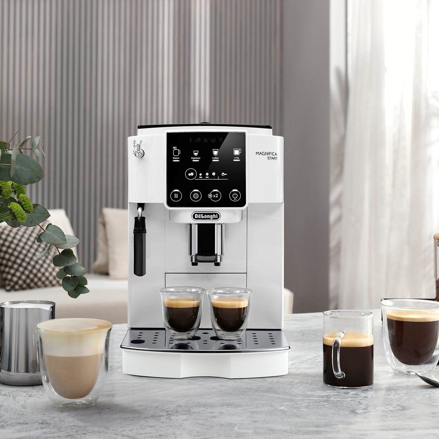 Entra en el mundo del café de grano a taza con De'Longhi Magnifica Start, que te ofrece todo lo que necesitas para empezar a tomar tus bebidas favoritas a base de espresso en casa. Cuenta con una interfaz fácil de usar y un llamativo acabado blanco, con una selección personalizada de 4 recetas diferentes de bebidas que se entregan con un solo toque.