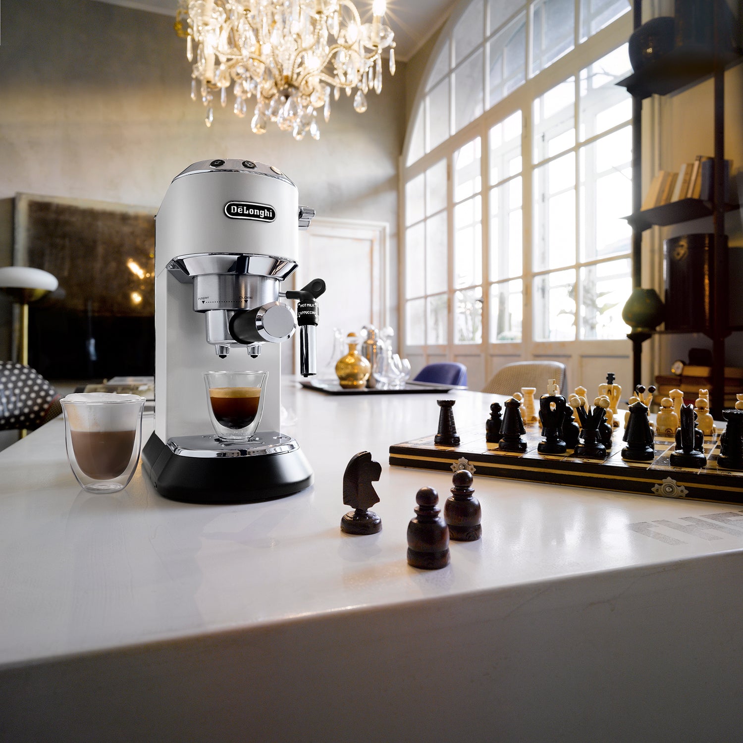 Cafetera elegante y compacta diseñada para complementar la encimera de tu cocina. Con su cuerpo de acero inoxidable y su acabado metálico brillante, la cafetera Espresso Dedica añade un toque de auténtico diseño italiano a cualquier cocina. Disfruta de un rico y suave Espresso y utiliza el sistema Cappuccino ajustable para vaporizar leche o darle a tu café un acabado con una cremosa espuma de leche.