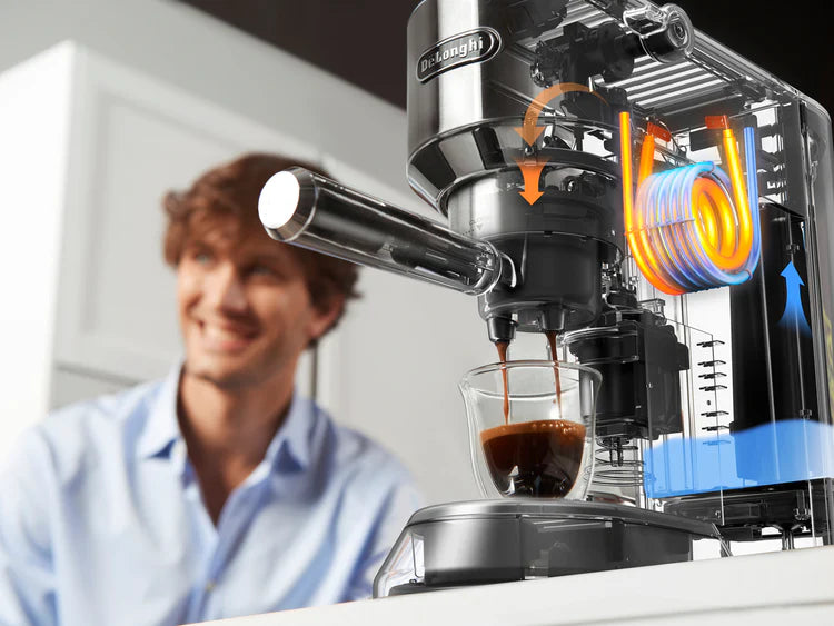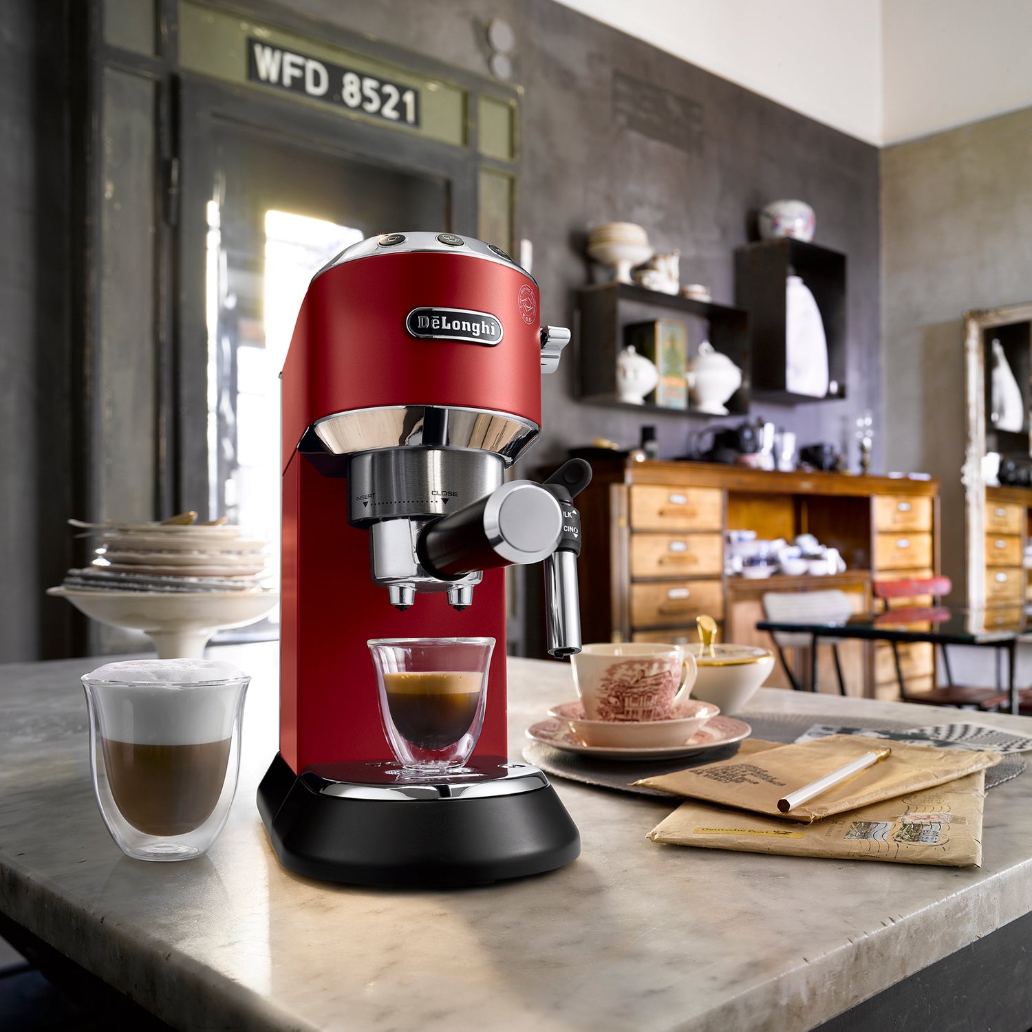 Cafetera elegante y compacta diseñada para complementar la encimera de tu cocina. Con su cuerpo de acero inoxidable y su acabado metálico brillante, la cafetera Espresso Dedica añade un toque de auténtico diseño italiano a cualquier cocina. Disfruta de un rico y suave Espresso y utiliza el sistema Cappuccino ajustable para vaporizar leche o darle a tu café un acabado con una cremosa espuma de leche.