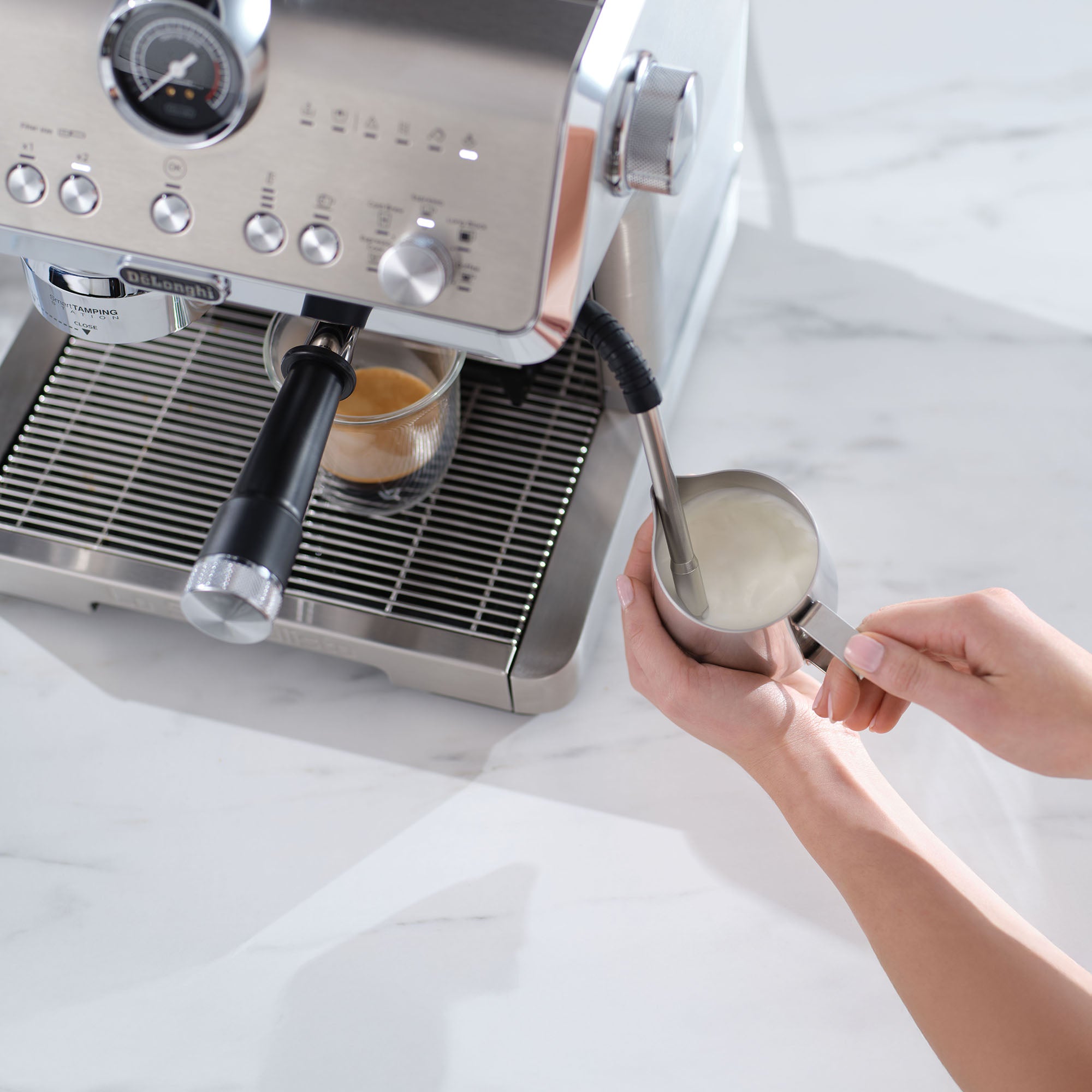 Potente varilla de vapor de tacto fríoLa varilla de vapor My LatteArt crea un vórtice que convierte la leche en espuma sedosa de microburbujas para elaborar arte del café. La varilla de tacto frío es más segura de manejar y más fácil de limpiar.