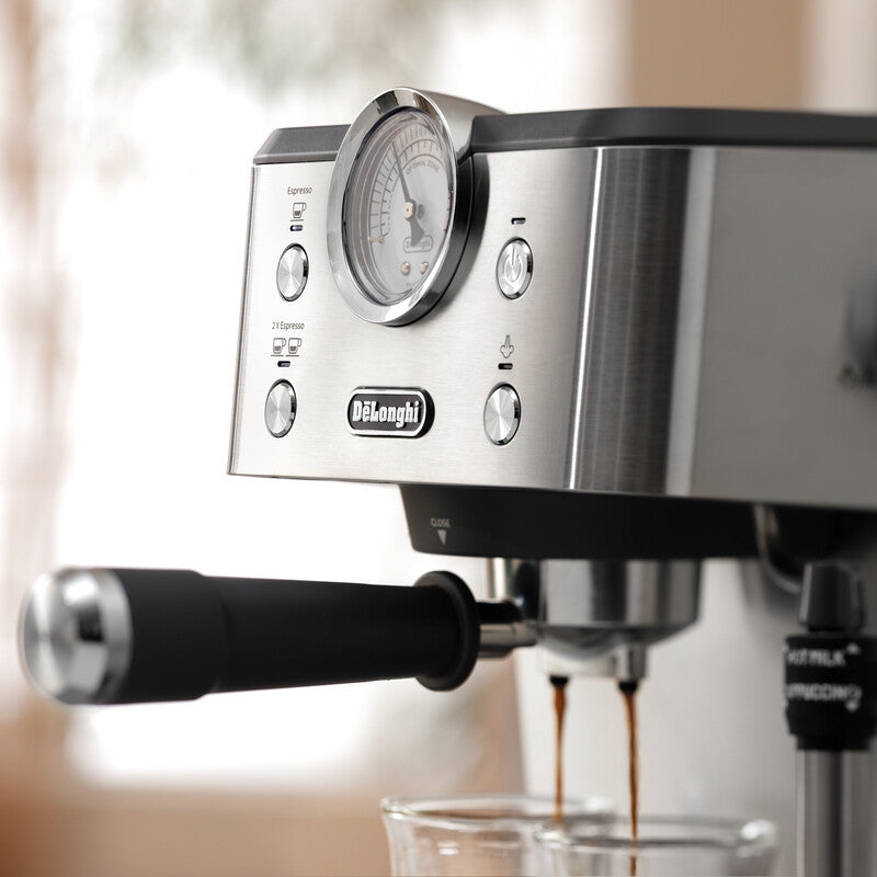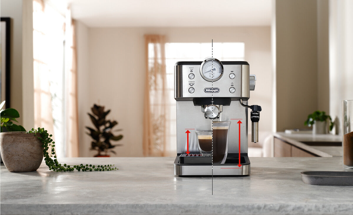 El diseño de acero inoxidable con detalles cromados premium refleja la elegancia del estilo italiano, complementado con un manómetro clásico que añade un toque distintivo. Su bandeja de goteo ajustable de 100 mm a 130 mm permite utilizar desde tazas pequeñas hasta vasos grandes, adaptándose a todas tus preparaciones.