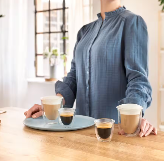 Los vasos para cappuccino De'Longhi son el regalo perfecto para cualquier amante del café. Fabricados con vidrio de borosilicato, resisten temperaturas extremas y la corrosión. Su diseño de doble pared mantiene las bebidas calientes por más tiempo y las frías, frías.